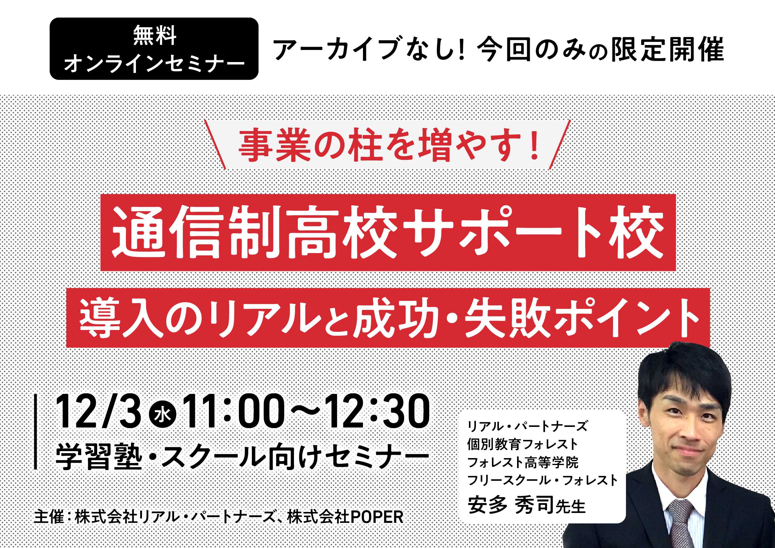 少子化が進む中、不登校の増加や多様な学びを求める動きから、通信制高校に通う生徒は年々増加しています。こうした背景から、生徒を高校卒業まで支える「通信制高校サポート校」への注目が高まり、新たな事業の柱として塾やスクールで導入する動きが広がっています。 サポート校の運営は、空き時間を有効に使えることもあり、既存の塾・スクール経営と親和性が高いのが特徴です。そのため、収益性や経営の安定につながり、新たな事業の柱となる可能性があります。一方で、塾とは異なる募集方法や多様な生徒への対応、運営体制の構築などの課題もあり、慎重な取り組みが求められます。 そこで今回のセミナーでは、実際にサポート校の立ち上げから運営までを行っている安多先生をお迎えし、サポート校の基本から導入メリット、成功・失敗のリアルな事例までをわかりやすくお伝えします。 安多先生は2022年に兵庫県宝塚市でサポート校を開校し、現在4年目。生徒数も16名にまで増加し、着実に拡大を続けています。現場で得たリアルな知見をもとに、これから導入を検討する方やサポート校の生徒数を増やしていきたい方にとって役立つヒントをお届けします。 新たなニーズに応える塾・スクール運営のヒントとして、ぜひご参加ください。